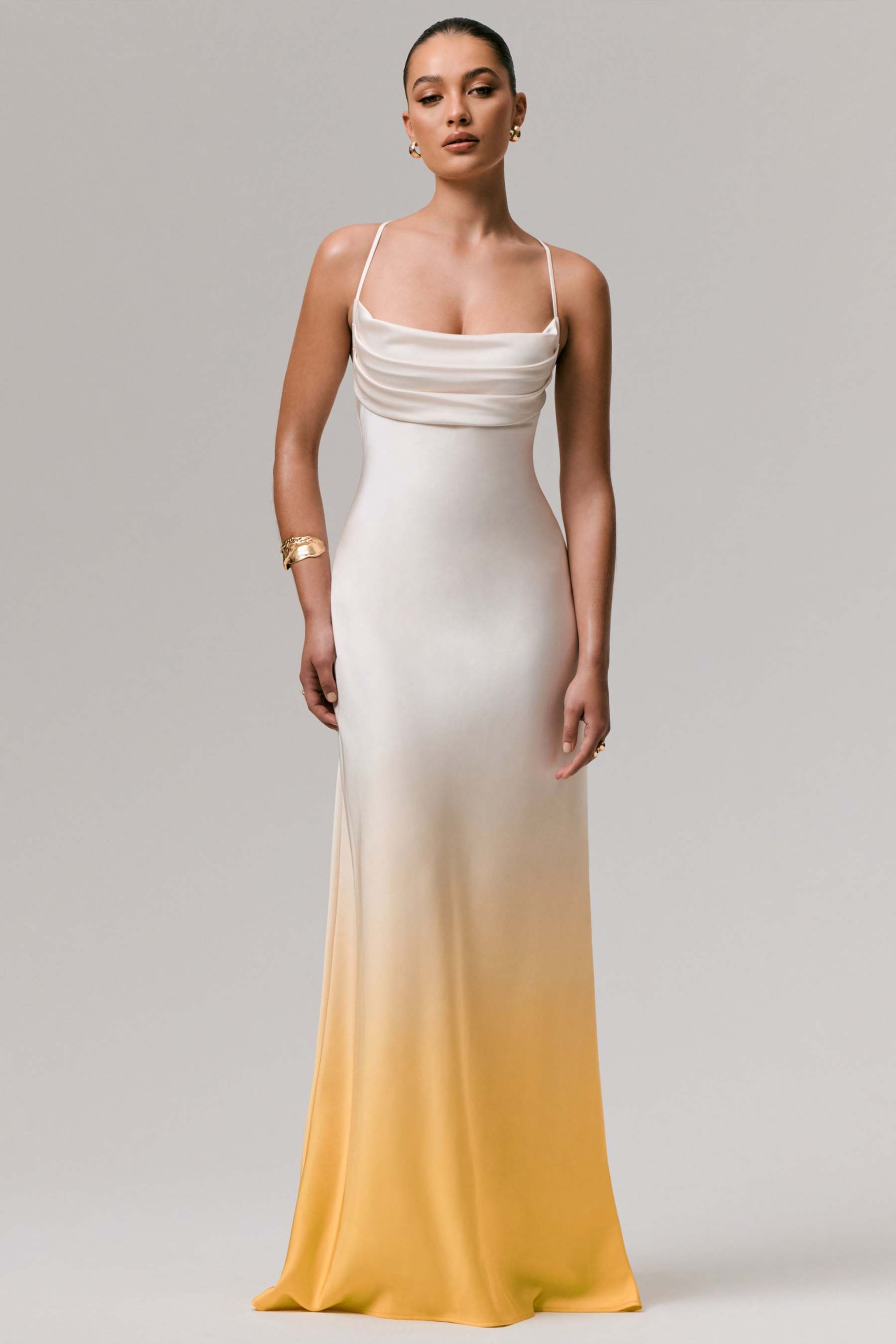 Timeless elegance meets allure in our latest head-turner, Crafted in a striking yellow ombre hue of our premium stretch satin, this maxi dress moves effortlessly whilst defining your silhouette. The draped cowl neckline adds an effortless feel to this show-stopper, whilst elegantly displaying your decolletage. Finished with a head-turning tie up back detail, that drops into a V-shape, providing a perfect fit that cinches your figure to perfection. Dress this style up, for black-tie moments, or pair with sandals and beachy waves for sunset cocktails.